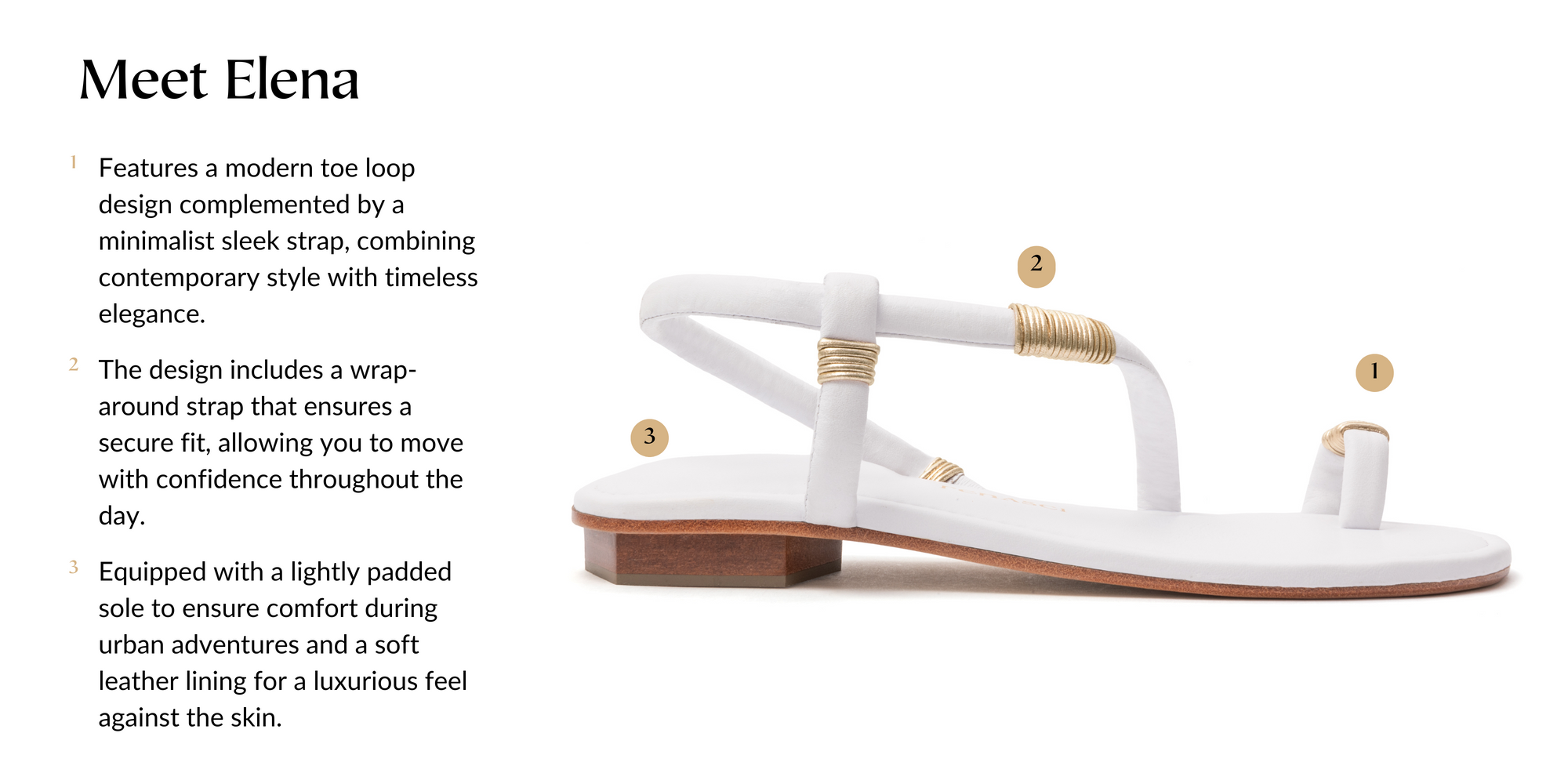 Introducing the Elena Wrap-Around Sandal: a modern city sandal that redefines urban elegance. With its sleek design featuring a toe loop and a slender strap, the Elena is a unique addition to any wardrobe. Crafted for the discerning woman who seeks a blend of style and functionality, its slight heel adds just the right amount of lift for an elevated look suitable for special events yet comfortable enough for everyday explorations.