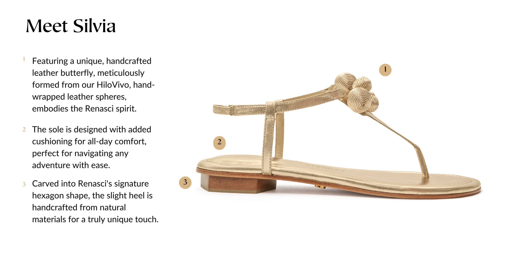 Introducing the Silvia T-Strap Sandal, a paragon of elegance and craftsmanship. Designed for the sophisticated spirit, this sandal is your ideal partner for both everyday elegance and vacation luxury. Crafted from 100% full-grain cowhide, the Silvia combines comfort with style, featuring an elastic back for a secure fit and our signature handmade HiloVivo butterfly accent that symbolizes the Renasci ethos of beauty and resilience.
